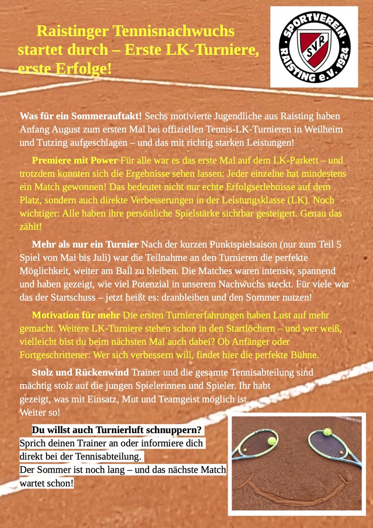 An den schönen Wochenenden von Ende September bis Mitte Oktober zeigten die Raistinger Tennispieler/innens großen Elan und Begeisterung bei den Vereinsmeisterschaften Einzel, Doppel, der Erwachsenen und Jugend. Den Start machten die 16 Herren im Alter von 18-70 und spielten die Einzel-Vereinsmeister aus. Neben der Hauptrunde wurde dann auch eine Trostrunde ausgespielt, so dass insgesamt 22 Spiel von Freitag bis Sonntag Nachmittag gespielt wurden. Im Finale der Hauptrunde standen sich mit Jan Drewes die aktuelle Nr. 2 der Herren 30 und mit Thomas Dietrich die Nummer 2 der früheren Herrenmannschaft Raistings gegenüber.